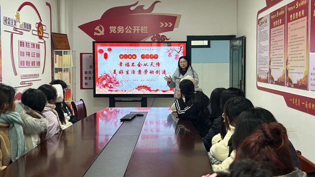 2024年新春开学之际,学生党支部书记叶燕平给入党积极分子上党课,系统梳理了习近平总书记关于奋斗的深情寄语,“幸福不会从天降,美好生活靠劳动创造”,“只有奋斗的人生才称得上幸福的人生”,“明天的中国奋斗创造奇迹”,激励同学们面对有机会干事业、有条件干成事的时代一定要倍加珍惜、倍加努力。