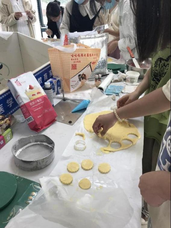 糖霜饼干是饼干中较为特殊的一种,以其细腻的外表、独特的内容夺人眼球,运用蛋清和糖粉打发出来的糖霜加上绘画手法,让饼干愈发多彩。朱玲老师为大家现场演示了饼干的制作方法,糖霜是如何做出来的,如何在饼干上用糖霜作出图案等,介绍了制作过程需要注意些什么。现场很快便呈现出一片繁忙景象。同学们全程聚精会神地倾听、观看,积极提问、互动交流,并且认真地参与到体验制作过程当中,亲手打蛋、和面、制作、放进烤箱。制作的过程是快乐的,大家跟随着老师的步骤一步步来,很快掌握了操作技巧,熟练操作起烤箱,大家还积极发挥想象力,做起了自己的原创糖霜饼干。