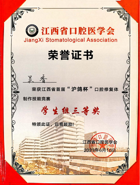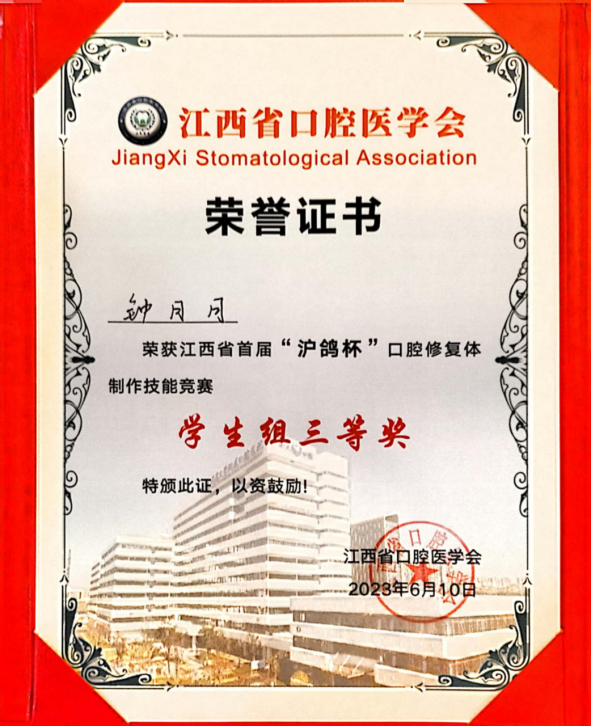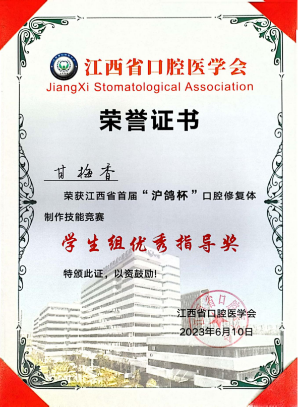 2023年6 月 10 号下午,江西省口腔医学会和江西省口腔修复工艺学专业委员会举办的江西省口腔修复工艺学专委会首届“沪鸽杯”口腔修复体制作技能竞赛在昌举行。大赛吸引了全省开设口腔医学技术(口腔修复工艺技术)专业的中高职、本科院校的师生参加。我院甘梅香老师带队参赛,经过激烈角逐,开元官网在此次比赛中共斩获学生组一等奖一项、三等奖两项、优秀奖一项和优秀指导老师荣誉一项。