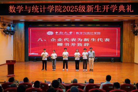 林坤松代表宁德时代为新生赠送《数学文化》书籍。他向全体新生表示热烈祝贺,并结合自身在新能源与工业数据领域的实践经历,鼓励同学们坚定对数学的热爱与信心。他指出,数学不仅是基础科学的核心,更是推动创新和技术突破的关键力量。他勉励同学们“既要读万卷书,也要行万里路”,积极通过生产实习、项目合作等方式走近产业一线,理解真实需求、服务实际场景,将抽象的数学理论与具体的国家战略和行业创新紧密结合,成为既懂理论又善应用的新时代数理人才。