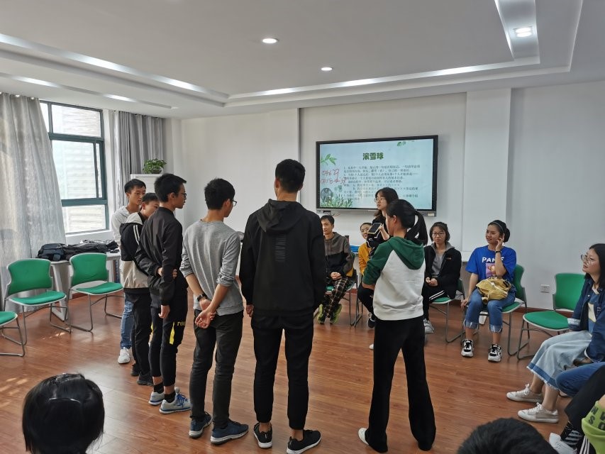 热身活动结束后便开始了第一项游戏——滚雪球。每个同学要把前面同学的介绍复述一遍然后再加上自己的介绍。这个游戏增进了同学间的了解,很好地活跃了气氛,也在一定程度上加深了同学间的感情。