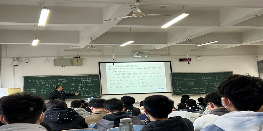 为了进一步提升青年教师的教学能力,2022年3月24日下午五六节,高等数学教学研究中心组织了《线性代数》课程课堂教学公开课活动,主讲教师秦栋栋副教授,地点新校区C座105。学校理科督导组王小玲教授、罗益民教授、周建普教授、周英告教授及数统院教学督导张鸿雁教授、李俊平教授、任叶庆副教授等和高数中心全体无课教师、学院部分青年教师,共计23位教师参加了此次公开课活动。