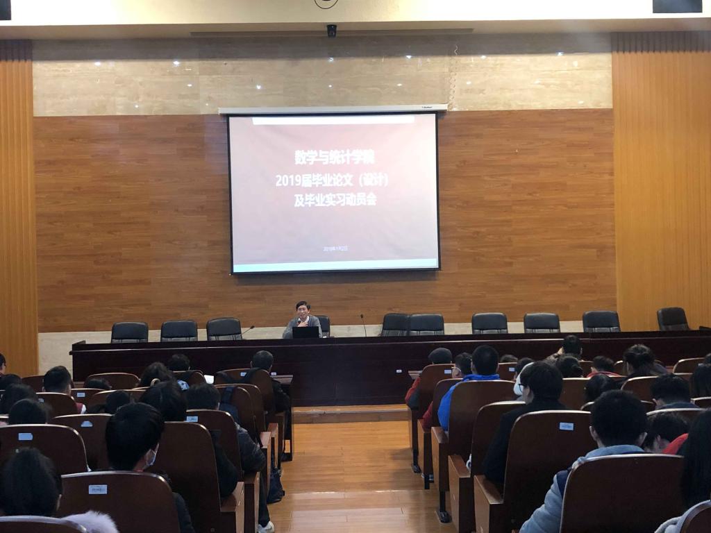 为做好2019届本科生毕业设计(论文)工作,进一步提高毕业设计(论文)水平和人才培养质量,数学院2019年1月2日下午3:00在数理楼1楼大报告厅召开了2019届本科毕业论文(设计)动员会,主持人beat365唯一官方网站教学副院长郑洲顺教授,2019届所有的本科毕业论文指导教师和2019届毕业生参加了会议,参会人数达300多人,会议对2019届的本科毕业论文的各项工作做了详细的安排,重申了beat365唯一官方网站本科毕业论文(设计)实施细则,会后还针对2019届统计专业下学期开学初前2周要外出进行毕业实习进行了实习动员,对学校与学院的实习教学规定进行再次的学习与强调。